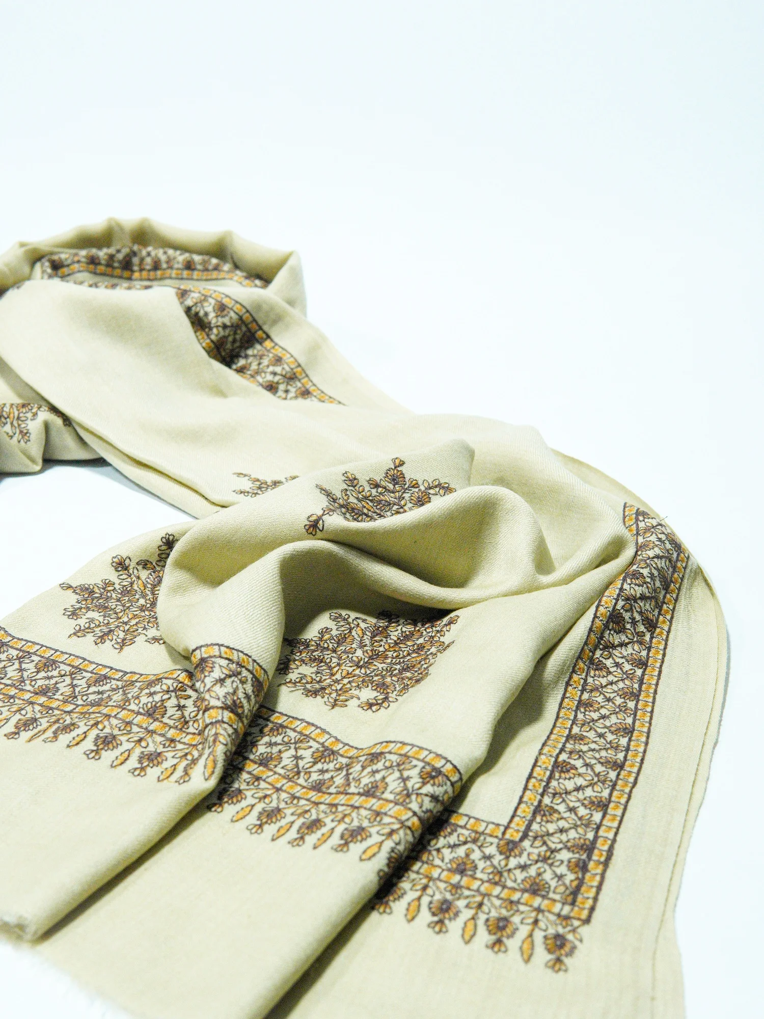 A luxurious pashmina-based shawl, perfect for adding elegance to any outfit. Its intricate border design gives a timeless and sophisticated appeal.