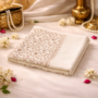 The soft ivory base beautifully highlights the delicate beige-brown jaal embroidery, creating a serene yet luxurious contrast. This refined colour palette exudes understated royalty, making it a perfect statement piece for formal wear and premium wardrobe collections.